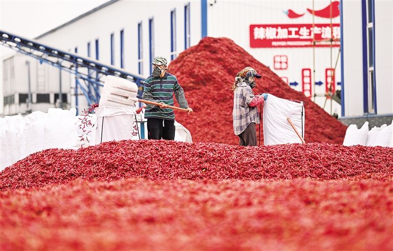 連日來,趁天氣晴好,巴彥淖爾市臨河區(qū)辣椒加工企業(yè)的工作人員抓緊晾曬辣椒。近年來,臨河區(qū)構建從種植、初加工到深加工的辣椒全產(chǎn)業(yè)鏈體系,推動辣椒產(chǎn)業(yè)從“賣原料”向“賣產(chǎn)品”“賣品牌”轉型升級。2025年該區(qū)辣椒種植面積達到11.6萬畝,引進優(yōu)良辣椒品種300余個。截至目前,已有具備辣椒加工能力的企業(yè)18家,年加工辣椒3.4萬噸左右。草原云·內(nèi)蒙古新聞網(wǎng)記者 孟和朝魯 攝