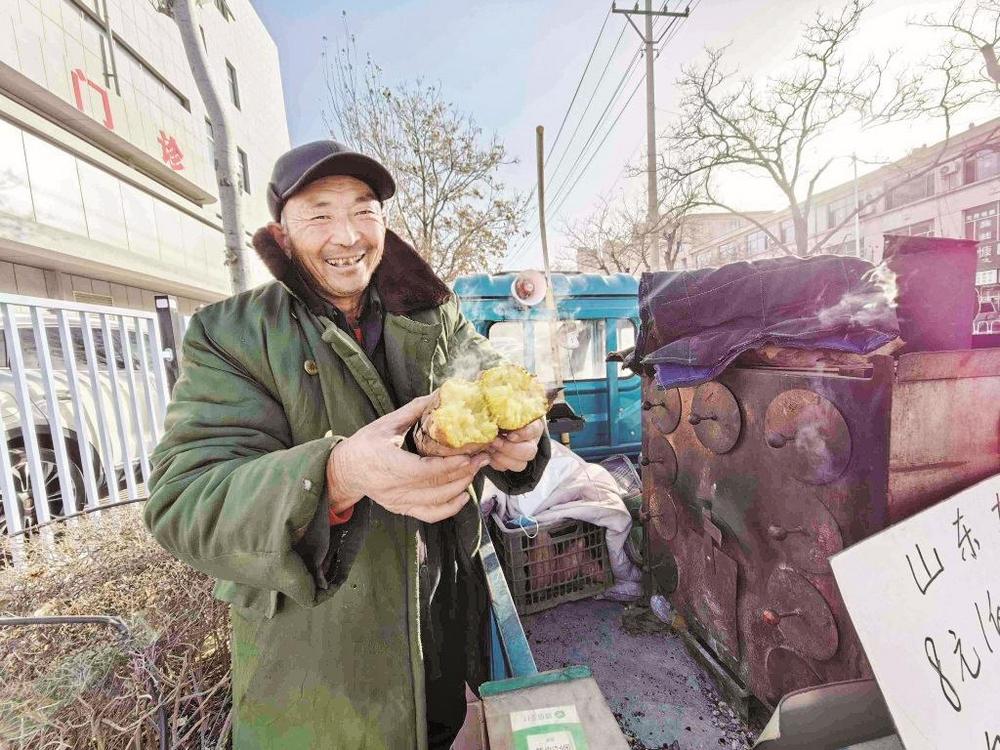 當寒風剛吹過烏海的街頭,就有一抹香甜格外引人垂涎。小販三輪車上安放著烤爐,爐上有十幾個小洞洞,每個洞里都“躺”著一只烤得發焦的紅薯。老板笑盈盈地向路人推銷,抽出一只中等個頭的紅薯,掰開后露出金黃軟糯的芯,熱氣騰騰,空氣中的香味越發濃郁。