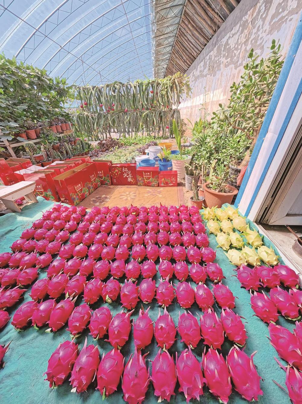 “今年的火龍果甜度特別高,果肉飽滿多汁,口感很不錯。”張金介紹道,豐收的火龍果品種有“金都一號”“軟枝大紅”“無刺黃龍”,都是市場認可度很高的優質品種。記者看到,這里采用生態種植模式,全程使用的都是有機肥,搭配了滴灌節水技術與物理防蟲手段,既保證了果實的天然口感與營養價值,又實現了綠色環保種植。“這也是客戶群穩定的原因,因為果子的品質很好啊。”張金樂道。