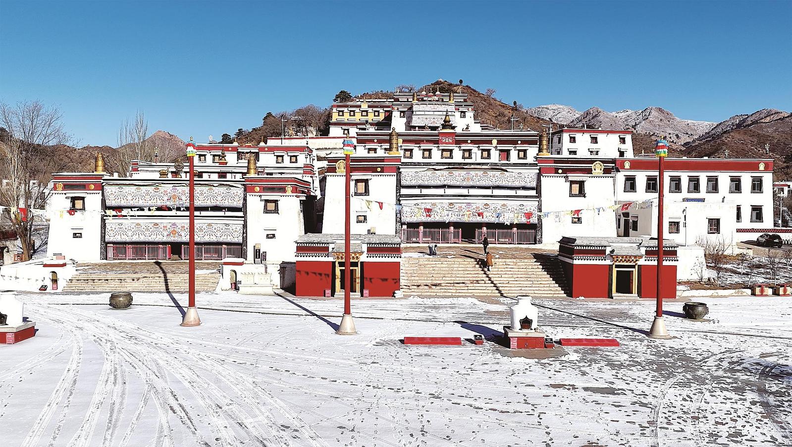 冬意漸濃,朔風送寒。近日,一場冬雪光臨五當召。雪后,紅墻黛瓦覆上皚皚白雪,經幡在寒風中輕揚,與遠山相映成畫。殿宇錯落有致,在白雪映襯下更顯莊嚴肅穆,飛檐翹角凝霜綴雪,似藏著千年的靜謐與虔誠。 (李楷謹 李鴻瑤)