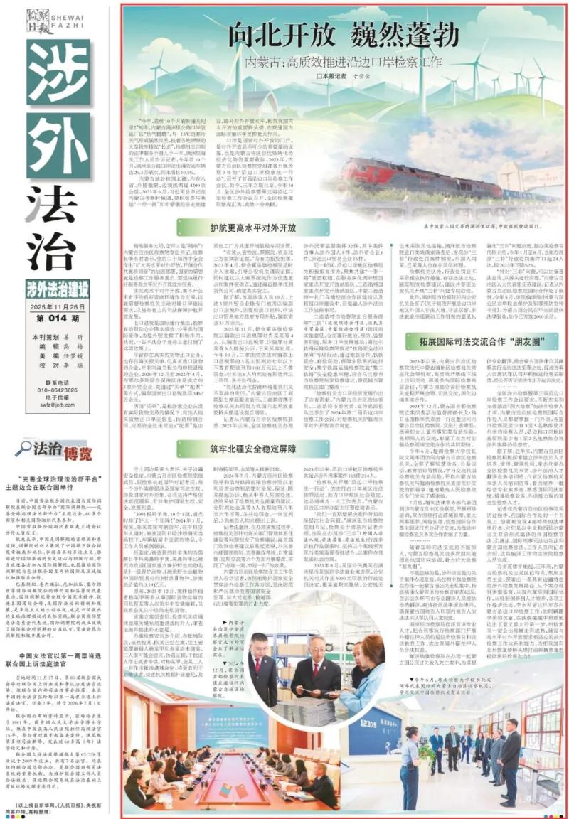2025年11月26日,《檢察日報》第9版刊發題為《向北開放 巍然蓬勃 內蒙古:高質效推進沿邊口岸檢察工作》的文章,報道了內蒙古地處祖國北疆,內連八省、外接俄蒙,邊境線綿延4200余公里。2023年,內蒙古自治區檢察院黨組部署開展為期3年的“沿邊口岸檢察統一行動”,三年來,內蒙古檢察機關立足區位特點,聚焦主責主業,探索出一條具有邊疆特色的涉外檢察發展路徑。