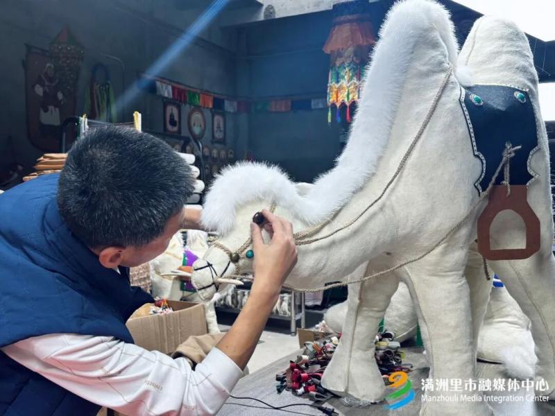 走進阿乳恩民族工藝品廠,一幅專注的匠心畫卷在記者眼前徐徐展開。廠長楊昌超正全神貫注地雕琢著雙峰駝造型的民族手工藝品。他細致地將駱駝“眼睛”配件穩穩粘貼,隨后拿起剪刀認真修剪羊毛材料,制作駱駝耳朵……陽光透過窗戶灑在作品上,楊昌超眼中滿是專注與期待,隨著巧手靈動勾勒,象征著草原豪邁、見證萬里茶道歲月的雙峰駝漸漸成型。