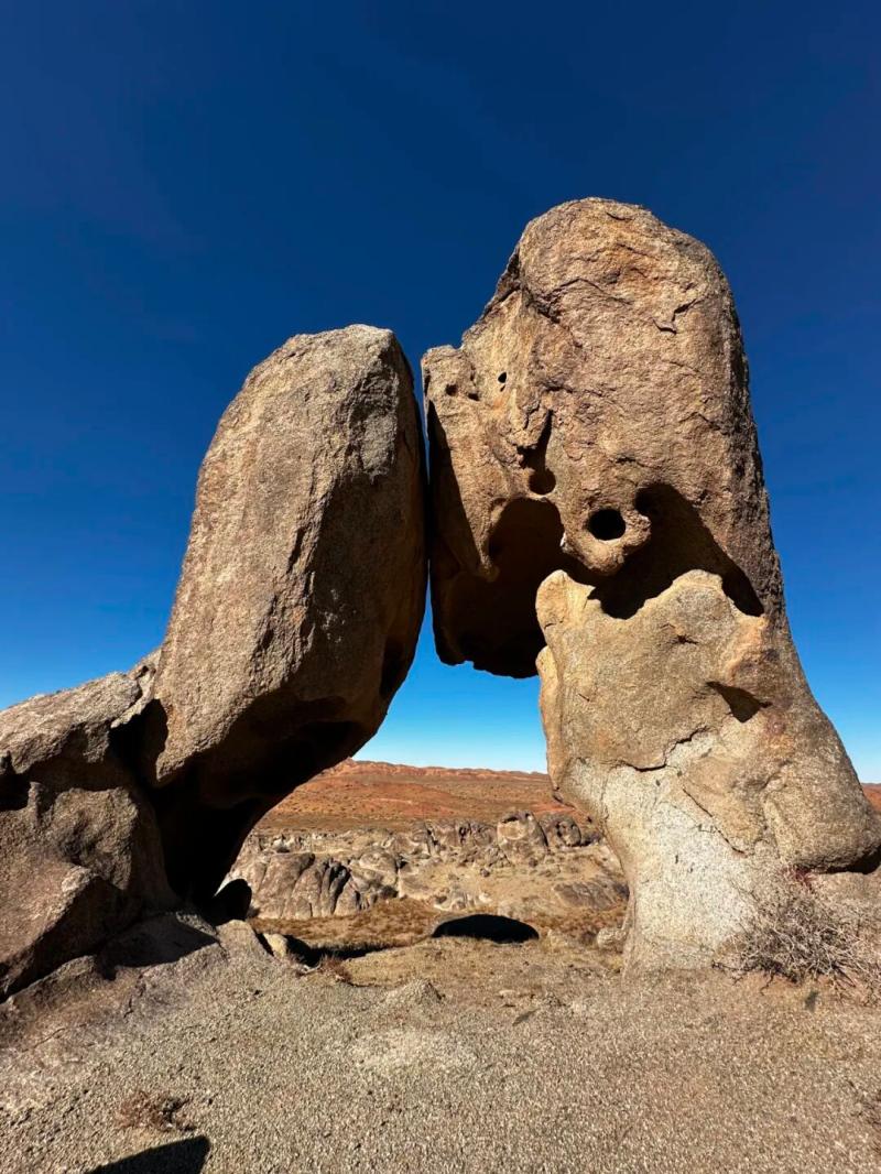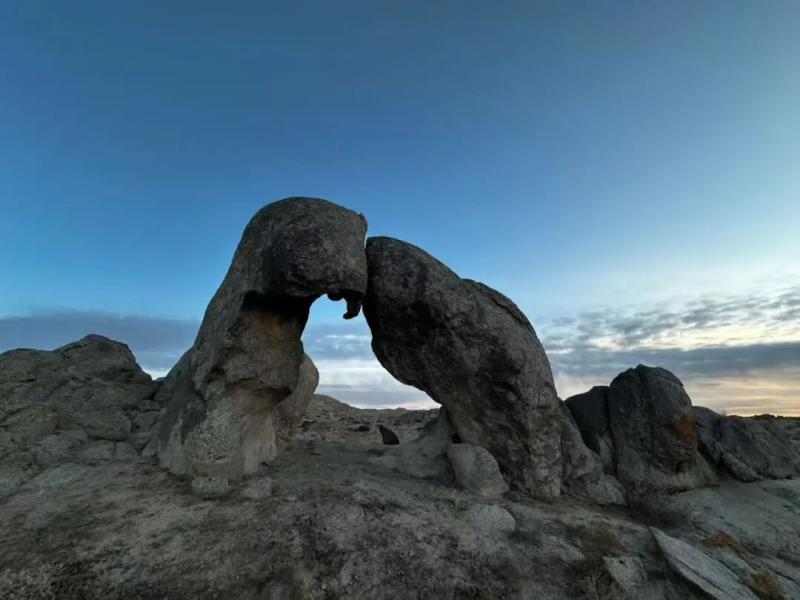 近日,阿拉善沙漠世界地質(zhì)公園管理局野外調(diào)查小組在阿拉善右旗雅布賴山新發(fā)現(xiàn)一處華力西期(距今約4.05—2.5億年)花崗巖形成的天然石拱門。該石拱門呈東西走向,跨度約6米,高度約5米,猶如兩個巨大拳頭對接而成,形態(tài)完整,景觀獨特,具有重要的地質(zhì)研究與保護(hù)價值。