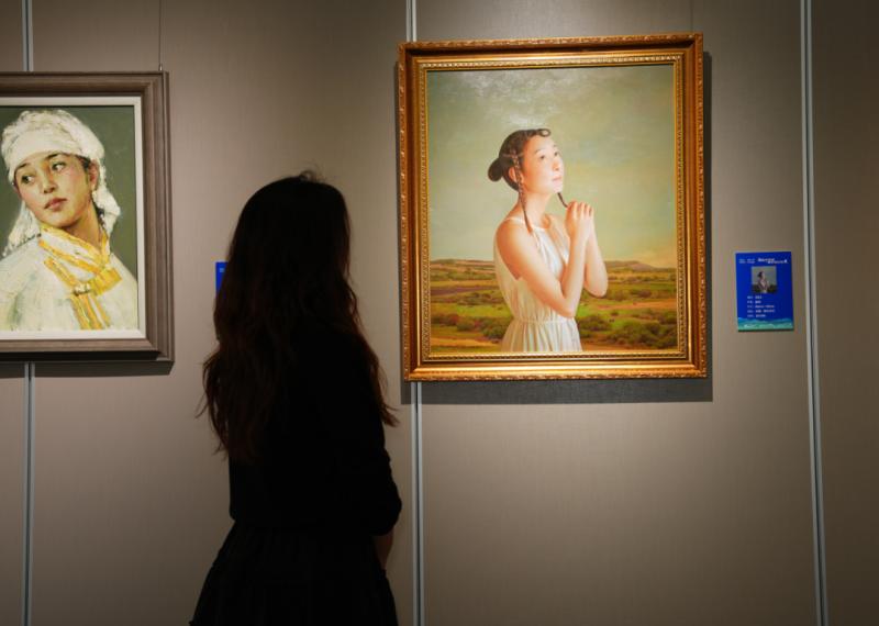 本次展出的油畫作品,大多是呼倫貝爾美術館館藏精品,左側展廳集中呈現了全國各地油畫名家走進呼倫貝爾采風創作的佳作,右側展廳則聚焦本土畫家的心血之作。右側展廳內,一位女生在一幅名為《盼》的油畫作品前駐足,她說:“畫中這位白色衣裙的女孩在濕地秋景的景致中,抬頭仰望的神情讓我感覺到有種‘在寧靜里藏著溫柔心事’的意境,很唯美。”